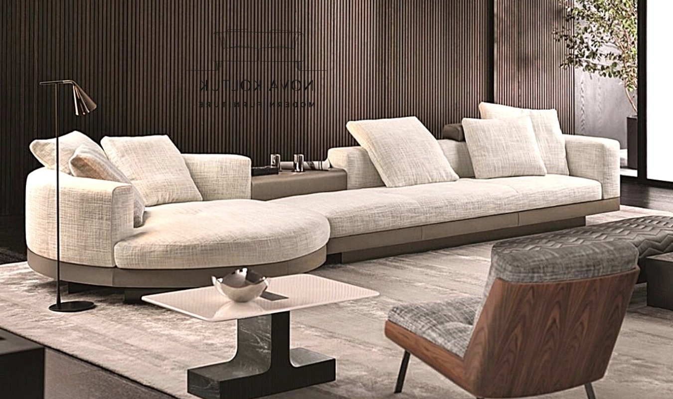 Elite modelinin en karakteristik özelliği, bir köşesinde yer alan devasa dairesel uzanma modülüdür. Görselde bej ve krem tonlarının hakim olduğu bu yumuşak hatlı yapı, mekana akışkan bir enerji katarken aynı zamanda çok yönlü bir oturma deneyimi sunuyor. Tasarımın alt kısmında yer alan koyu renkli kaide yapısı, koltuğun geniş gövdesini zarif bir şekilde yerden yükselterek modern bir kontrast oluşturuyor. Bu dairesel form, geniş salonlarda odak noktasını belirlerken, mekana daha davetkar ve yumuşak bir atmosfer kazandırıyor.