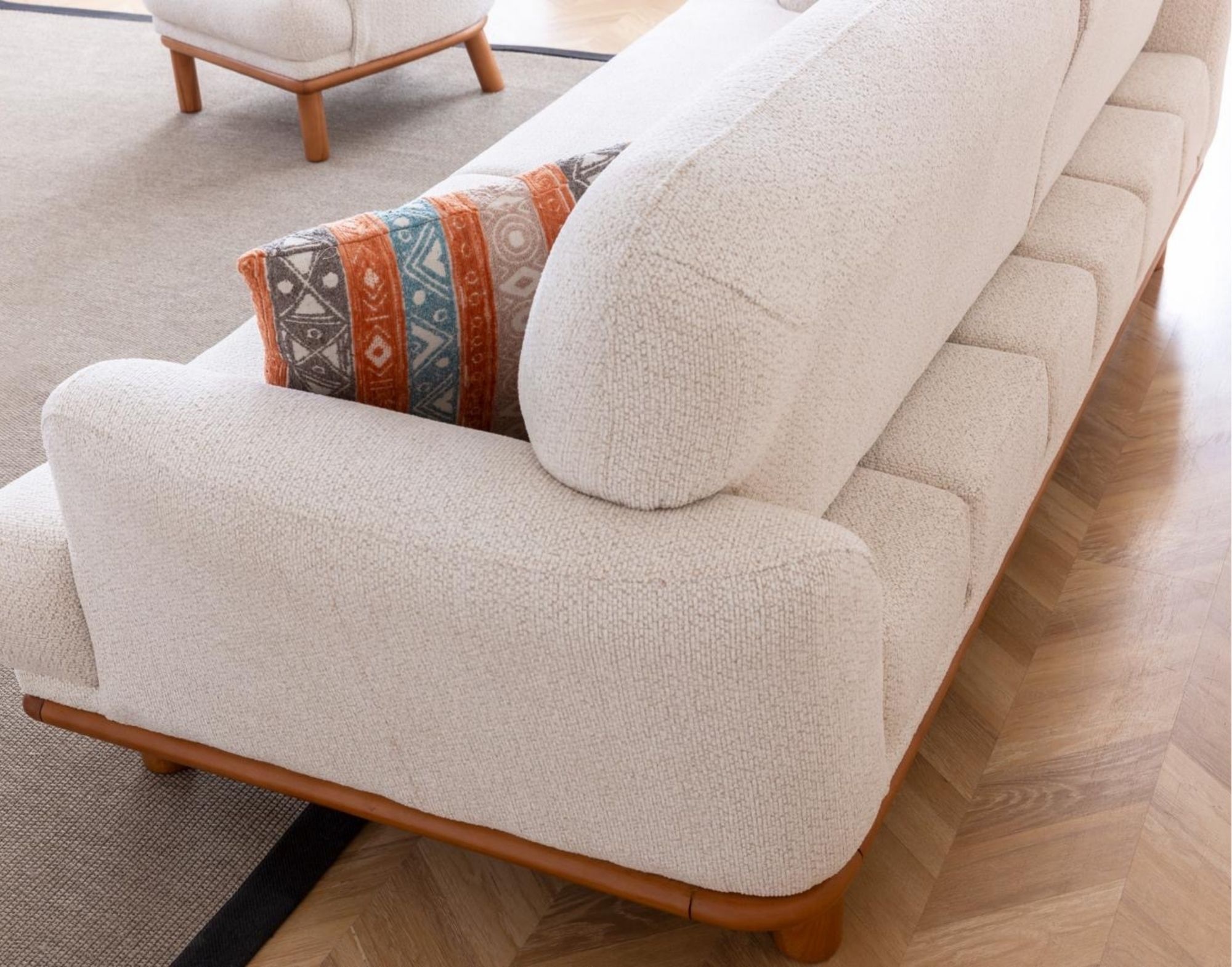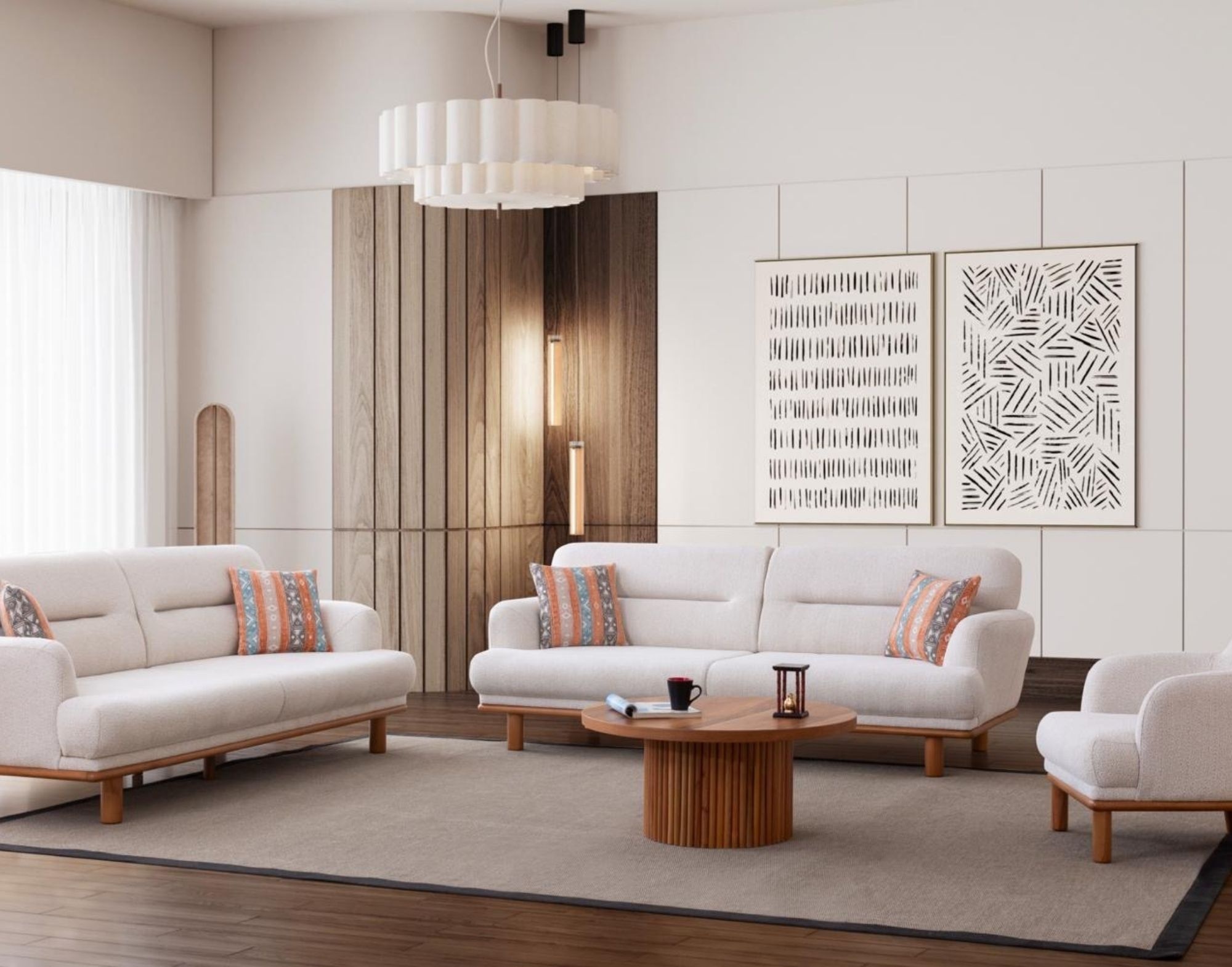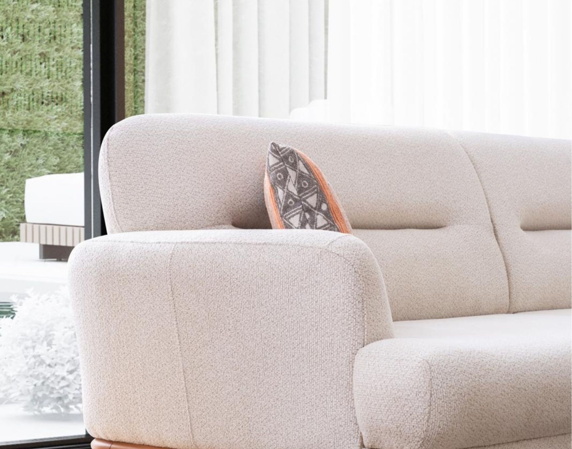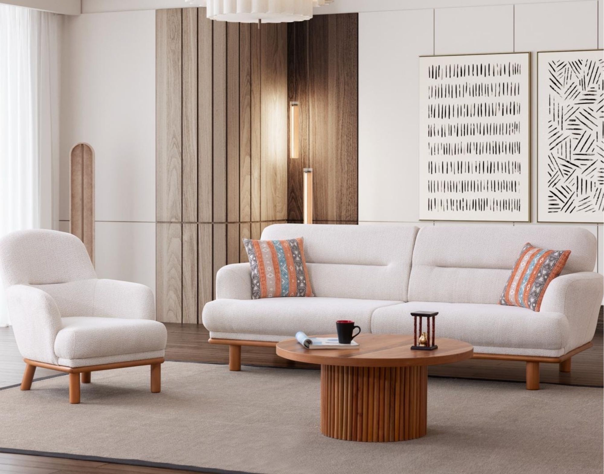 Mimoza Koltuk Takımı’nın en dikkat çekici özelliği, görselde de görüldüğü üzere skandinav esintili ahşap ayak yapısıdır. Yerden yüksek tasarımı, sadece estetik bir hafiflik kazandırmakla kalmaz, aynı zamanda modern robot süpürge kullanımına uygun yapısıyla temizlik kolaylığı sağlar. Koltukların kavisli sırt yapısı ve dolgun minderleri, mekana davetkar bir sıcaklık katarken; krem ve ekru gibi açık tonların kullanımı, odanın daha geniş ve ferah görünmesine yardımcı olur.
