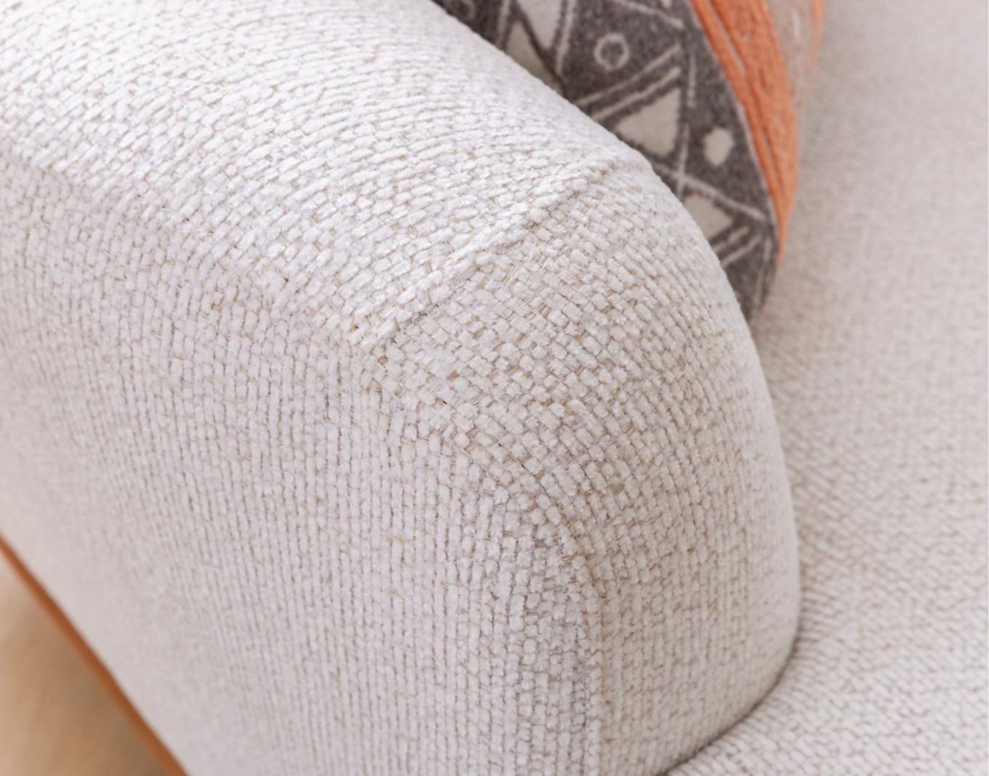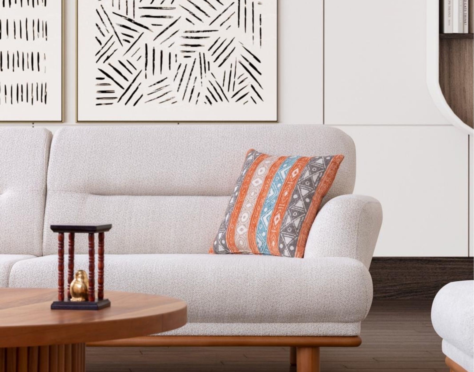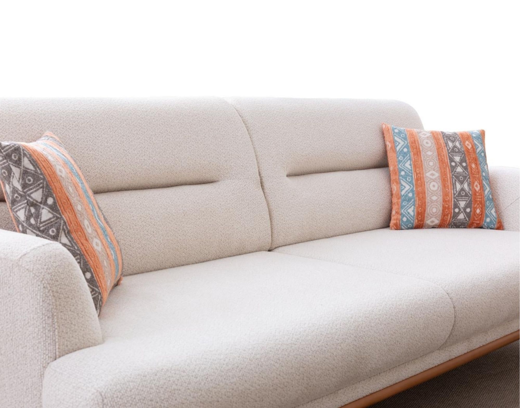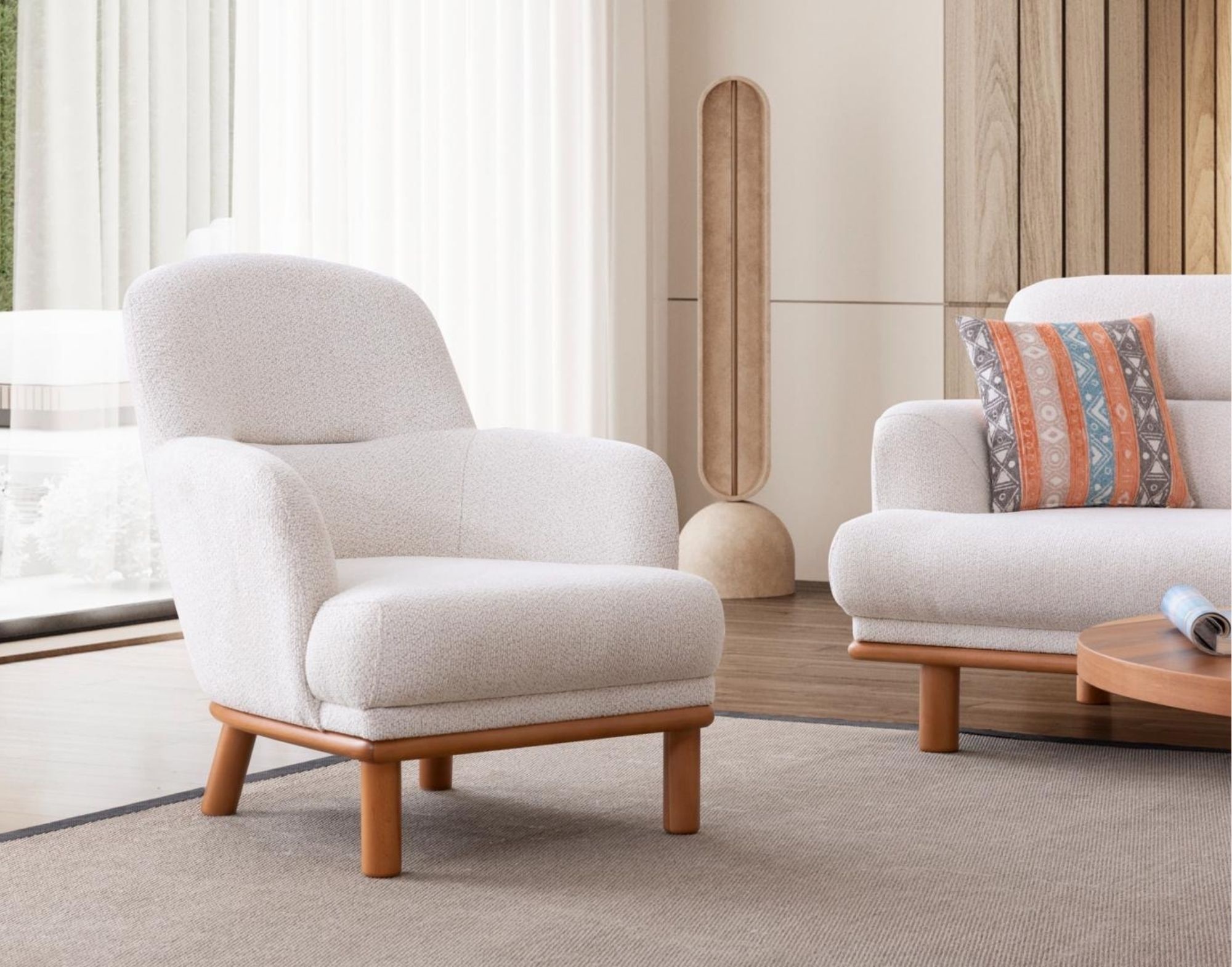 Mimoza Koltuk Takımı’nın en dikkat çekici özelliği, görselde de görüldüğü üzere skandinav esintili ahşap ayak yapısıdır. Yerden yüksek tasarımı, sadece estetik bir hafiflik kazandırmakla kalmaz, aynı zamanda modern robot süpürge kullanımına uygun yapısıyla temizlik kolaylığı sağlar. Koltukların kavisli sırt yapısı ve dolgun minderleri, mekana davetkar bir sıcaklık katarken; krem ve ekru gibi açık tonların kullanımı, odanın daha geniş ve ferah görünmesine yardımcı olur.