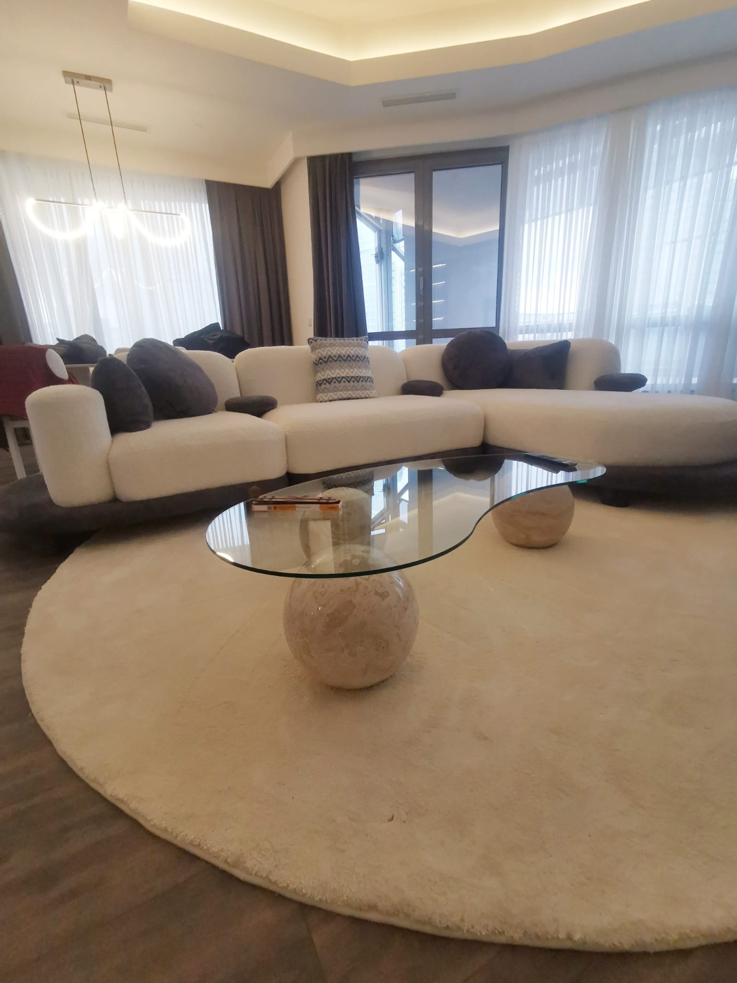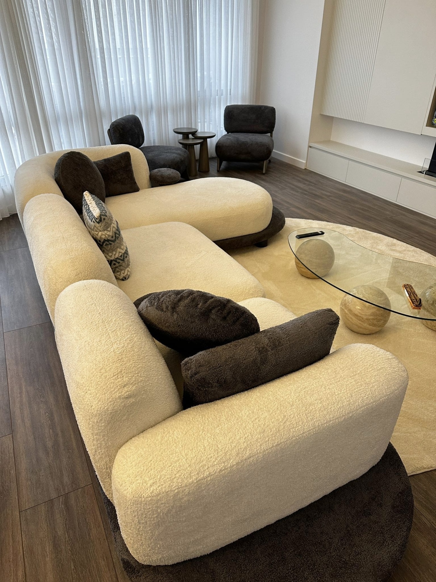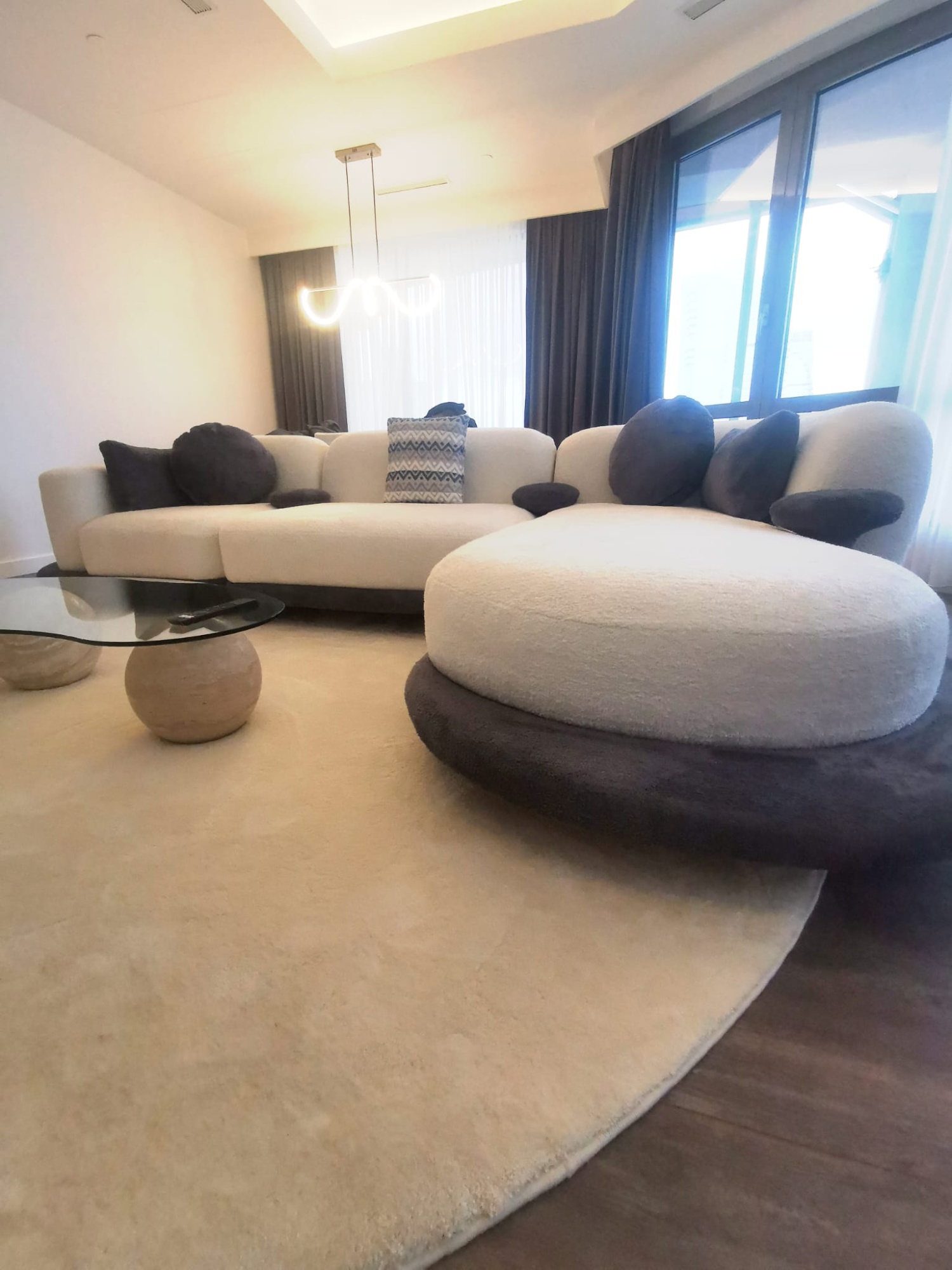 Valide Oval Kesim Köşe Takımı’nı tamamlamak için kullanılan aksesuarlar, onun karakterini daha da ön plana çıkarır. Görseldeki gibi doğal ahşap detaylı mobilyalar, dev kaktüsler gibi yeşil bitkiler ve geometrik desenli halılarla birleştiğinde, doğallık ile modernizmin dansı ortaya çıkıyor. Koyu zeminler üzerinde yükselen bu tasarım, odak noktası olmayı başarırken, sunduğu geniş uzanma alanı sayesinde evin en sevilen köşesi haline geliyor. Kaliteyi, konforu ve sıradışı tasarımı bir arada arayanlar için Valide, bir mobilyadan çok daha fazlasını, bir yaşam vizyonunu temsil ediyor.